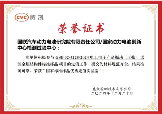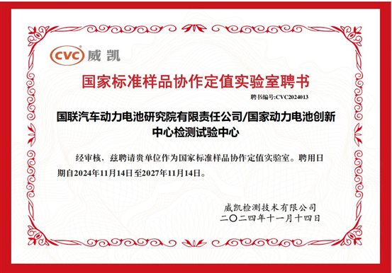 國(guó)聯(lián)研究院國(guó)家動(dòng)力電池創(chuàng)新中心檢測(cè)試驗(yàn)中心獲聘中國(guó)電器科學(xué)研究院股份有限公司CVC威凱“國(guó)家標(biāo)準(zhǔn)樣品協(xié)作定值實(shí)驗(yàn)室”,并榮獲“國(guó)家標(biāo)準(zhǔn)樣品優(yōu)秀定值實(shí)驗(yàn)室”。