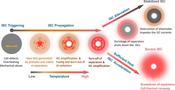 電池微短路演變過程與內部機制示意圖