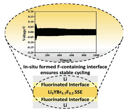 創(chuàng)新團(tuán)隊(duì)以Li3YBr6(LYB)鹵化物固態(tài)電解質(zhì)為基體進(jìn)行F摻雜,制備出了Li3YBr5.7F0.3固態(tài)電解質(zhì),該固態(tài)電解質(zhì)通過(guò)與金屬鋰原位生成高濃度氟化物界面鈍化層,顯著改善了鋰金屬負(fù)極在全固態(tài)電池的循環(huán)穩(wěn)定性,解決了鹵化物固態(tài)電解質(zhì)材料應(yīng)用于金屬鋰負(fù)極固態(tài)電池的關(guān)鍵技術(shù)瓶頸,為行業(yè)在高比能量全固態(tài)電池發(fā)展方面提供了新思路。