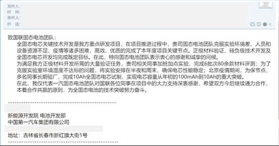 12月8日,國(guó)聯(lián)研究院固態(tài)電池團(tuán)隊(duì)收到股東單位中國(guó)第一汽車(chē)集團(tuán)有限公司新能源開(kāi)發(fā)院電池研究所發(fā)來(lái)的感謝信。