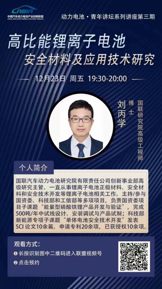 12月23日,國家動力電池創(chuàng)新中心“動力電池·青年講壇”系列講座第三期線上直播方式開講。本期講座邀請國聯(lián)研究院創(chuàng)新事業(yè)部高級研究主管劉丙學博士專題分享高比能鋰離子電池安全材料及應用技術研究相關內容,互動交流探討安全添加劑材料設計及應用,安全電解液設計及應用, 高比能電池安全技術集成等方面的知識,為動力電池安全材料及應用技術研究提供思路。來自企業(yè)、行業(yè)機構、科研院所等專業(yè)人士500余人線上參講座直播,取得了互促共進、共同提升的效果。