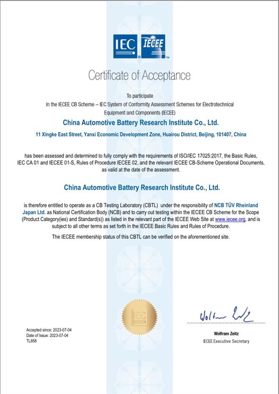 7月4日,國聯(lián)汽車動力電池研究院有限責任公司(China Automotive Battery Research Institute Co., Ltd.)以專業(yè)的測試能力,獲得IECEE審核認可,成為電池領域(BATT)的CB測試實驗室(CBTL)(證書編號:TL858),標志著國聯(lián)研究院檢測試驗中心在電池檢測認證領域正式邁進了國際化實驗室序列。